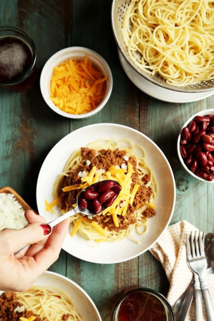 This chili, some of you from Cincinnati are no doubt nodding your head with knowing, is a cinnamon + chili + cumin and clove spiced meat dish served two ways, three ways, or FIVE WAYS: over spaghetti pasta topped with diced white onions, grated cheddar cheese, and kidney beans.