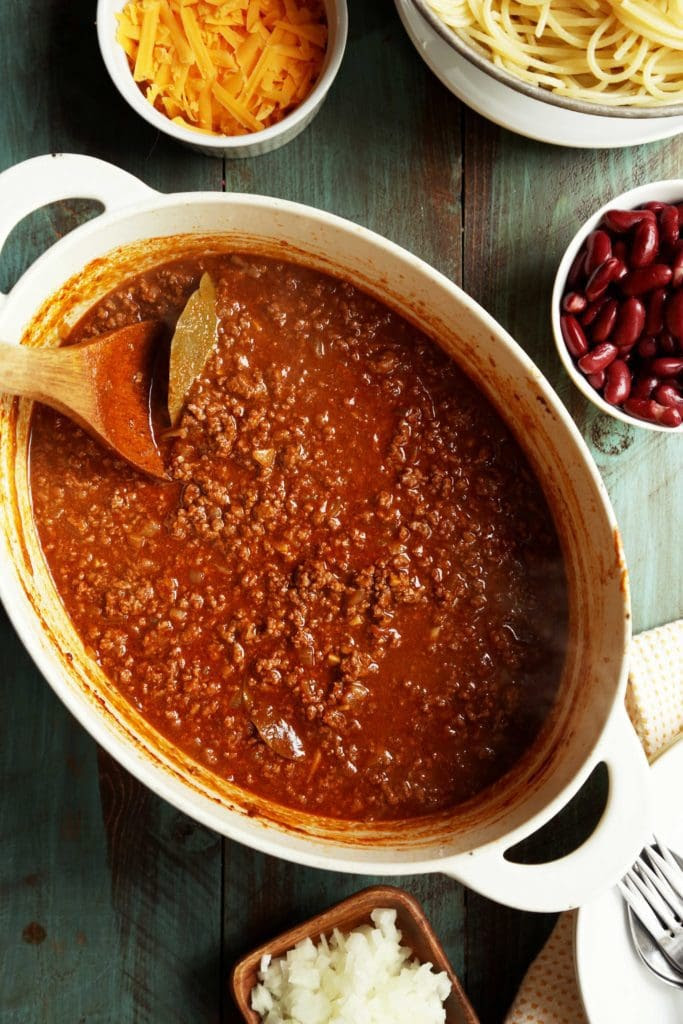 I’ve seen some of traditional, Mediterranean spiced Cincinnati Chili recipes that also include dark chocolate but this recipe opts out. I can only go so far where spaghetti and cheddar are involved.
