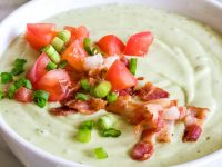 This Chilled Avocado Soup is everything you’re thinking it might be. Avocados are blended with chicken or vegetable broth, sour cream, cilantro, lime and a little bit of Tabasco sauce. The texture is velvety, and the taste is so incredibly good. It’s topped with chopped tomato, green onions and crisp bacon.
