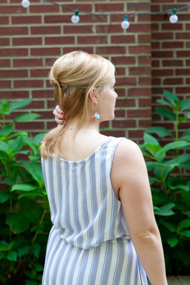 This was my first time sewing a garment out of truly flowy fabric. I was nervous about it but it ended up being pretty easy. Cutting it was really the hardest part, especially the long skirt pieces…trying to keep the stripes straight all the way down took some patience and attention to detail. Scroll down for all the pattern and fabric details, my notes, and a gallery with more images!