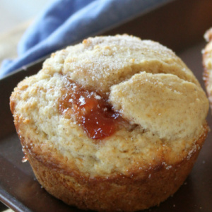 This is not your typical, decadent muffin recipe that tastes like cake. It’s lighter for sure. There’s only 1/2 cup of sugar and 1/4 cup butter in the whole recipe. The addition of Greek yogurt helps keep them moist. And a spoonful of strawberry jam in the middles of the muffins is what provides the burst of flavor in the muffins.